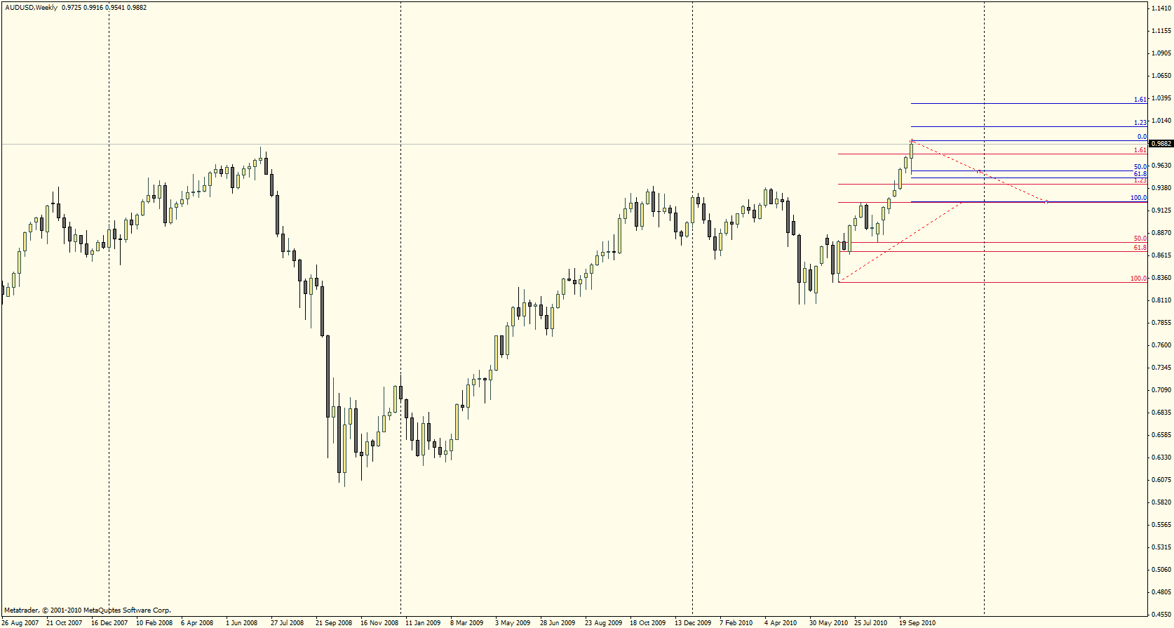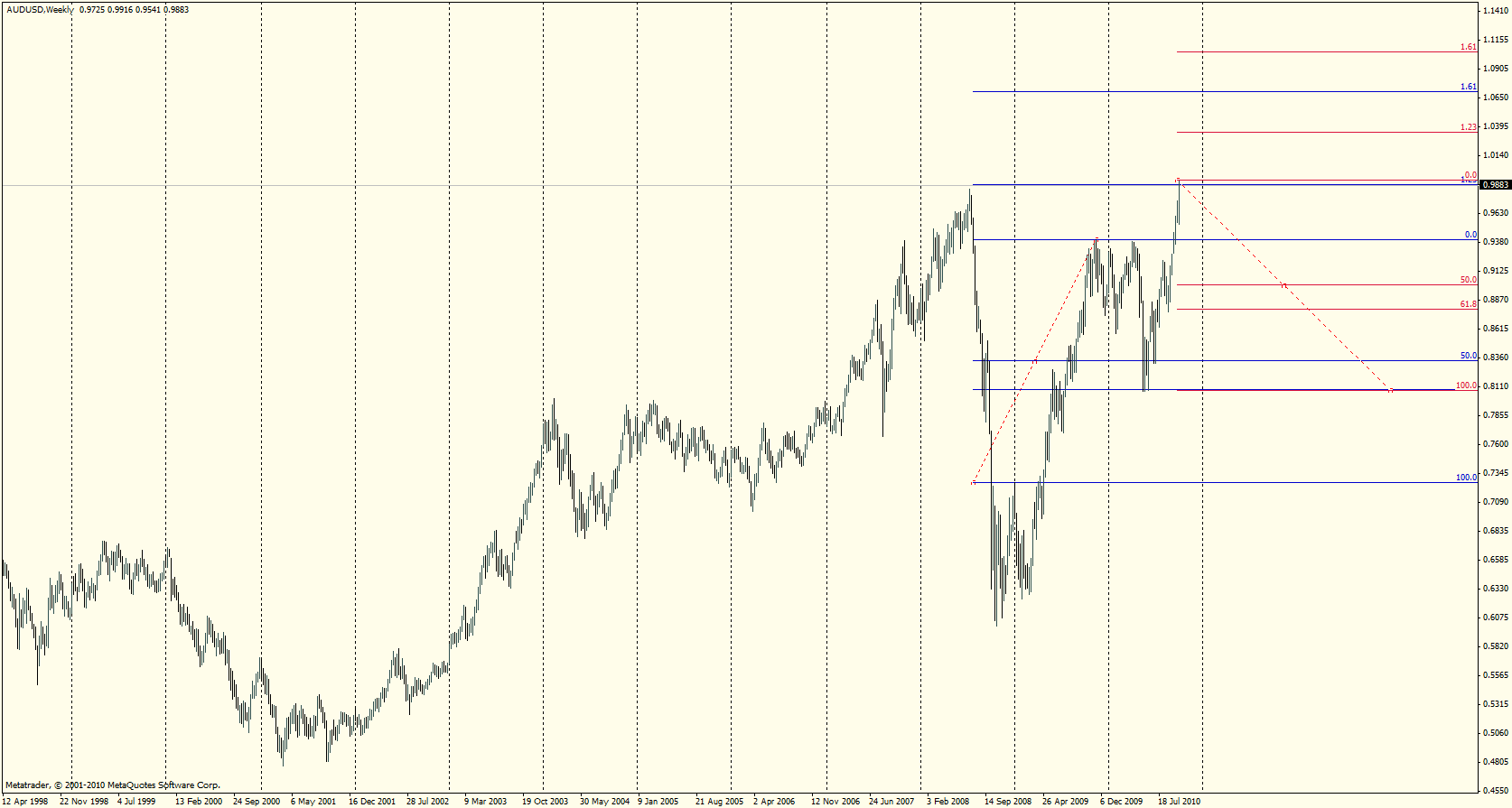 Das ist halt Charttechnische Interpretationssache. Nach "meiner" Charttechnik, um den Trend zu bestimmen reicht im Wochenchart ein Retrace auf 95.70. Ich benutze die Extension Technik, dh. wenn ein Hoch oder Tief gebrochen ohne Korrektur , dh. der Kurs läuft über die 1.61 Extension dann zeichne ich von Hoch zu Hoch bzw. Tief zu TIef. Der AUS/USD befindet sich meiner Interpretation nach in einem Extension Long, da das 1.61er Level überschritten wurde. Ich zeichne also vom letzten Hoch zum aktuellen Hoch um des Retrace Level zu bestimmen.