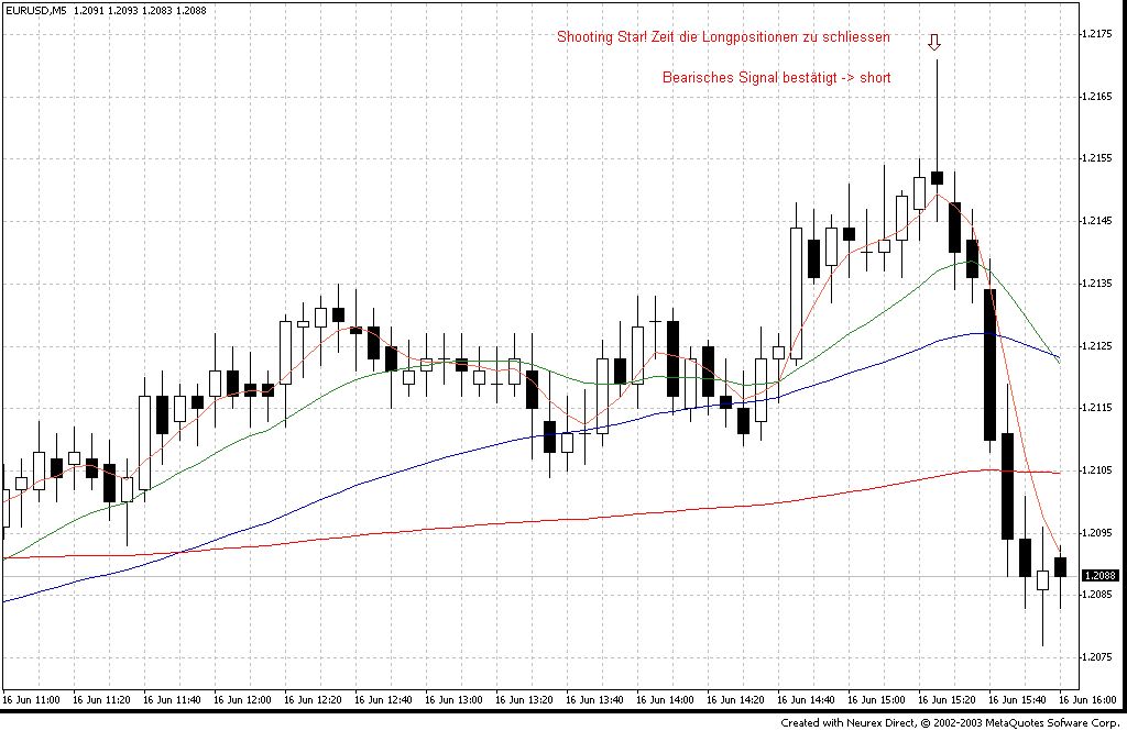 Im 5 min Chart war die Information des Candlestickmusters Shooting Star ein Volltreffer.