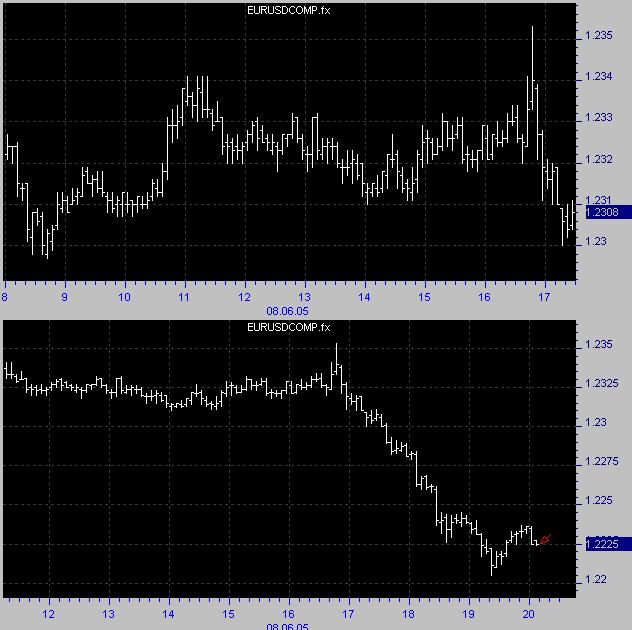 Diese Seitwärtsbewegung sieht man bis 17.30 Uhr GMT auch im oberen Chart. Hier ist die (im unteren Chart so offensichtliche) Seitwärtsbewegung aber kaum als solche zu erkennen.