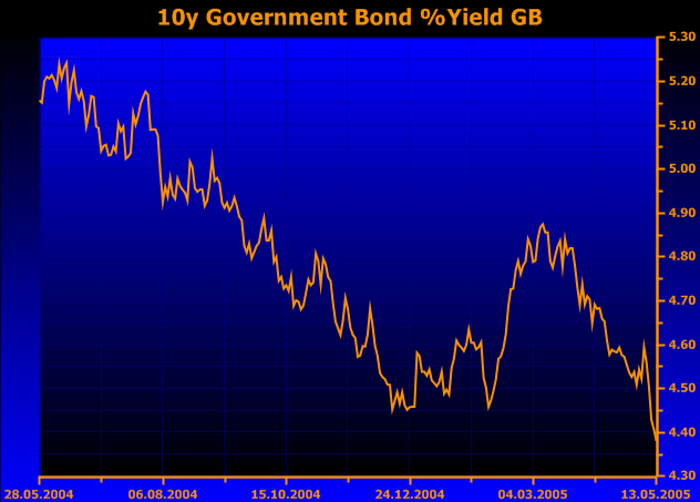 Überhaupt ist der Cable im Moment sehr schwach, er verliert gegen beinahe jede andere Währung relativ stark an Wert. Ein möglicher Grund ist die Underperformance der 10y Bonds aus GB, wie in der beigefügten Grafik zu sehen gibt die Rendite dieser Bonds in den letzten Wochen stark nach, im Gegensatz zur generellen Richtung am Bondmarkt. Schon im frühen europäischen Handel ist er vom Schlusskurs am Freitag betrachtet eine ganze Big Figure nach Süden gewandert, diese Tendenz hat anscheindend auch weiter Gültigkeit.