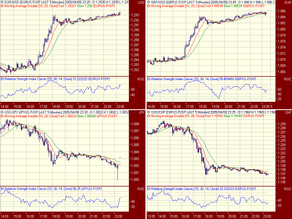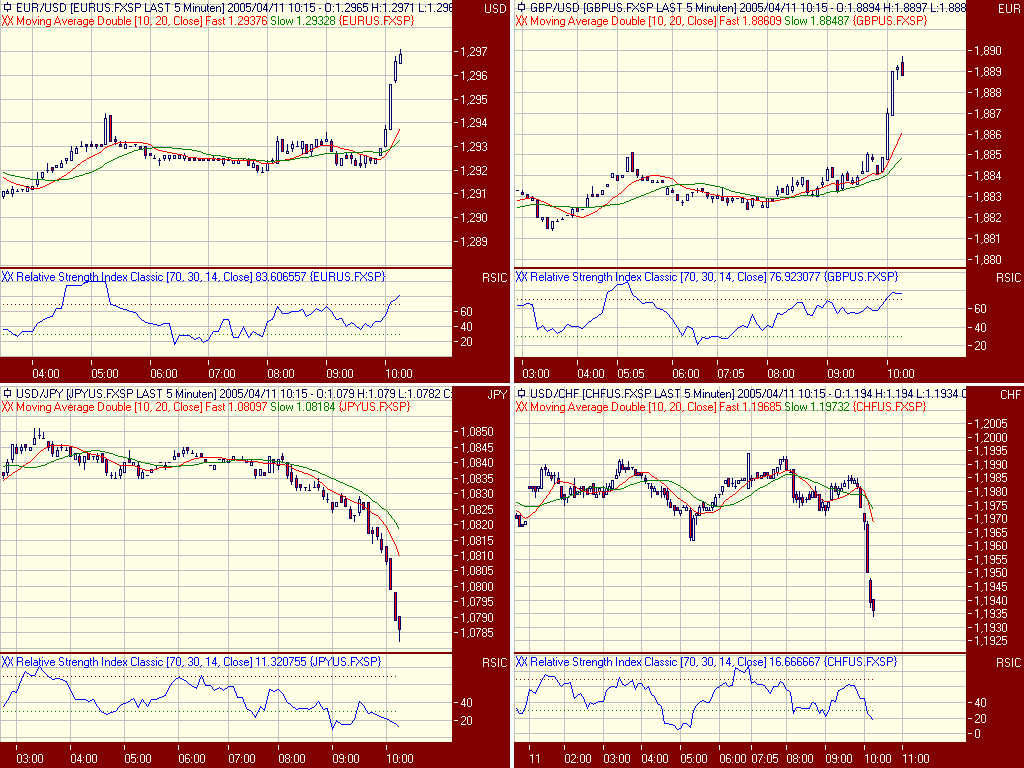 Heute so gegen 9:20, 30 Uhr gab es im JPY auf meinem Chart ein erstes Signal, dass sich der Dollar nunmehr nach unten verabschieden möchte. Gegen 10:00 Uhr dann folgten die anderen Pärchen mit ihren Signalen.