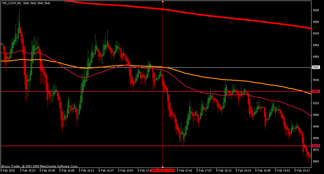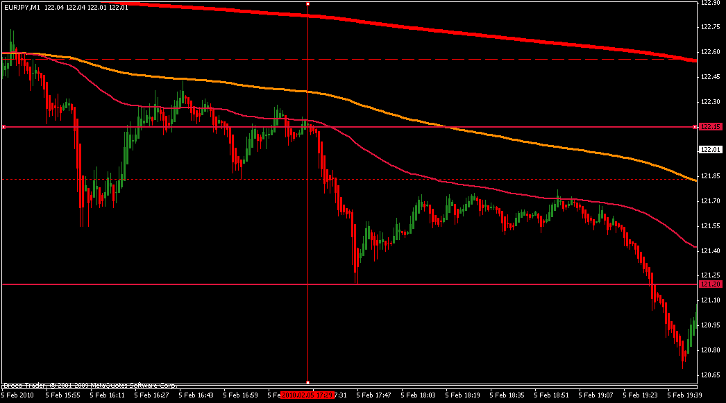 ok, hier mal mein Trade Beispiel von Freitag im EJ mit Hilfe des Dow Futures. Im Moment ist der Yen der Save Haven und der Euro sicherlich das größte Risiko mit der Situation in Griechenland,Spanien und Portugal. Das heißt im Moment, wenn die Equity Märkte fallen wird der Yen gekauft. Kurz vor 17.30 Uhr gab es eine kleine Seitwärtsphase im Dow Future. Ich hatte auf ein Break der 9920 gewartet, was auch um 17.30 Uhr geschah. Der EJ hingegen hat ein kleines Retracement gemacht und notierte um 17.30 Uhr immer noch in der Nähe der 5min 20 EMA. Die Priceaction des EJ hat also ein wenig hinter der des Dow Futures "gelagt". Bin dann short zu 122.15 in der Hoffnung die 9920 im Dow Future würde nachhaltig fallen, was dann auch geschah. Der EJ hat das Break seines 1min Swing lows nachgeholt und in etwa doppelt so viele Punkte verloren wie der Dow Future in der gleichen Zeit. Ich habe das Break leider allerdings nicht mitgenommen und am Swing low bei 121.85 die Position geschlossen.