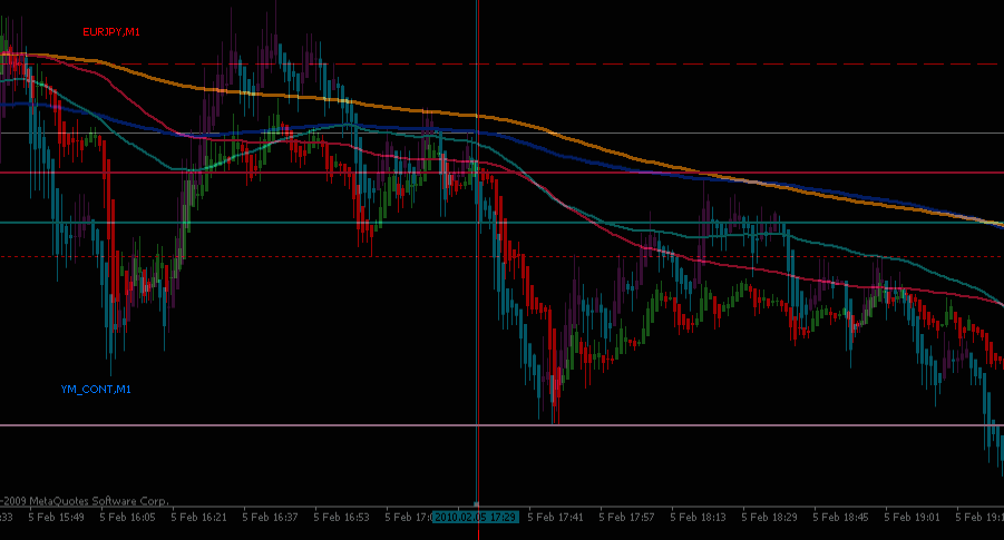 Ich war im EUR/JPY unterwegs mit einen offenen 1min Wallstreet Future Chart im Hintergrund. Mit jeden 20 Punkte Move im DOW Future hat der EJ gleich einen 50 pip Satz gemacht. EJ und Dow korrelieren ja imMoment wegen der Risko Appetit/ Risiko Aversion Geschichte fast 100%. Man könnte sagen EJ ist Dow auf Speed.