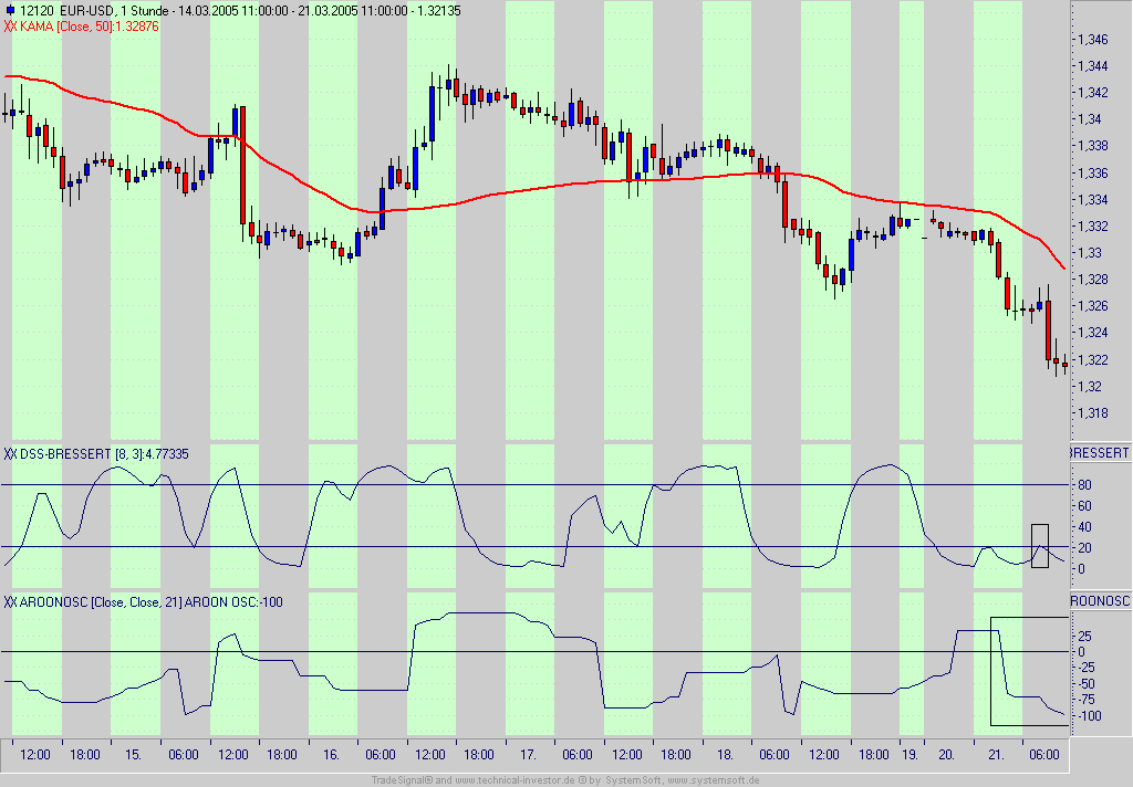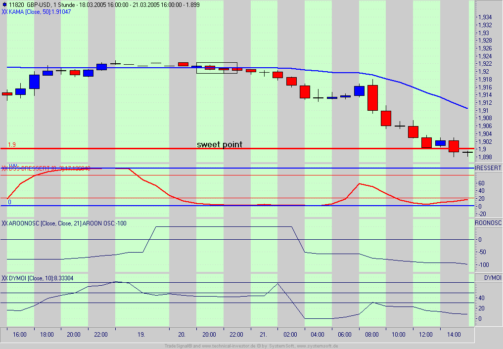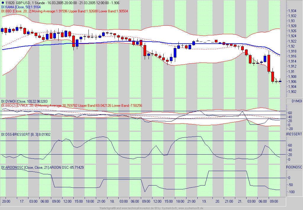 Man muss aber auch sagen, dass es im Forexhandel hier EUR/$ sehr viele Kerzen mit großen Docht gibt. Ich denke, man kann das nicht immer davon abhängig machen. Z.B. wie wärst am 15.03.05 19-20 Uhr (DSS-Schnitt nach oben) vorgegangen da waren ja auch 3 Dojis und Aroon fiel ab.