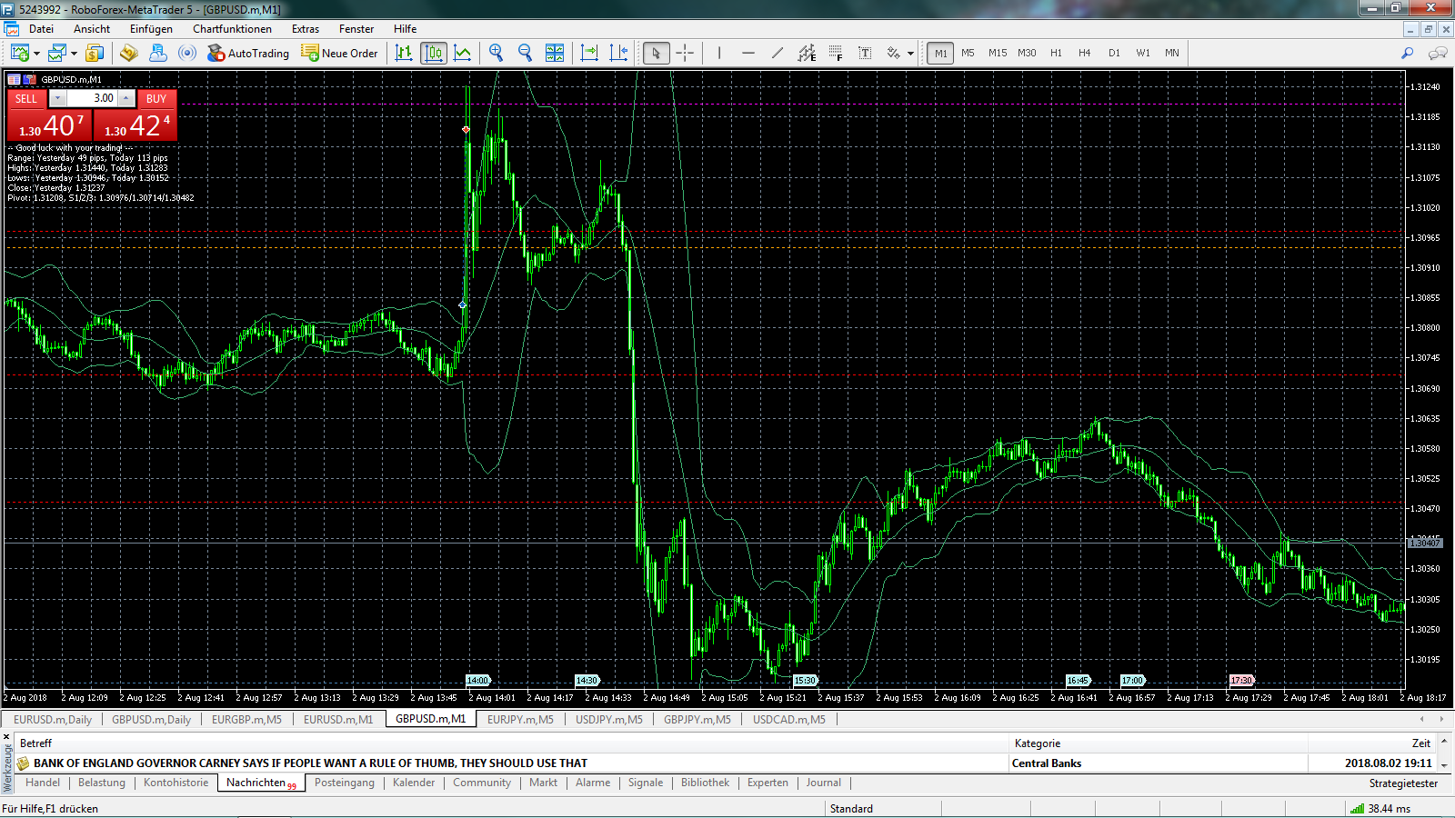 Gibt es News-Trader hier? Habe heute erstmalig vor dem Zinsentscheid eine Bracket-Order eingegeben: 1,3085 oben und 1,3068 unten. Wahnsinnigen Dusel beim Einstoppen gehabt, da er Limit berührte und kurzeitig nach unten ging, sodass ich 0,4 pips günstiger reinkam. Manuell bei 1,31154 geschlossen. Das waren 30,8 pips oder 2,8% vom Tradingkapital in 2 Sekunden. So macht`s Spaß! Leider