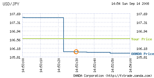 Ad Dobis Trade: ich finde so einen Trade auch super gewagt, aber weniger wegen des TPs. Wenn anscheinend jedes Wochenende die FED/Paulson eine Investmentbank entweder zum Tode verurteilt oder mittles Steuergeld die Absolution erteilt, würde ich nicht gerade dann einen JPY-Trade übers WE halten wollen - wenn es einen Gap gibt, dann unter solchen Umständen. Oanda finde ich auch ein bischen wahnsinnig in so einem Umfeld übers Wochende usd/jpy Kurse zum Freitags-Close zu stellen. Sollte nächstes Wochenende der nächste Kandidat über die Klinge springen, überleg ich mir sicher meinen ersten Oanda-Sonntags-Trade..