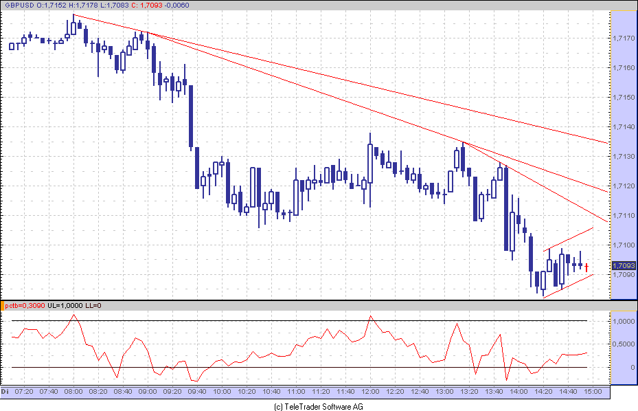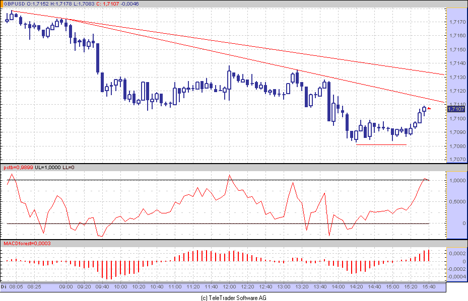 Mit sehr viel Fantasie kann man im 5 min Chart vom EUR/USD etwas dreieckförmiges erkennen. Aber vertrauen tue ich dem nicht.