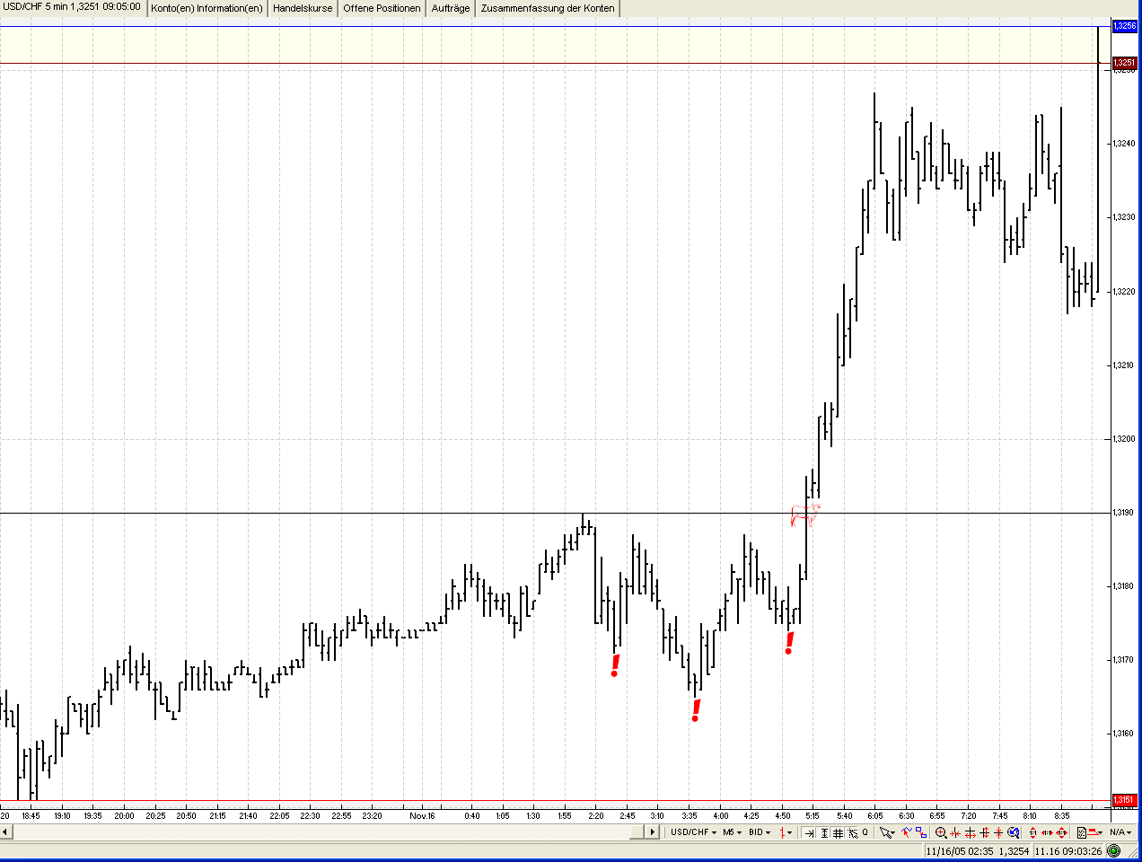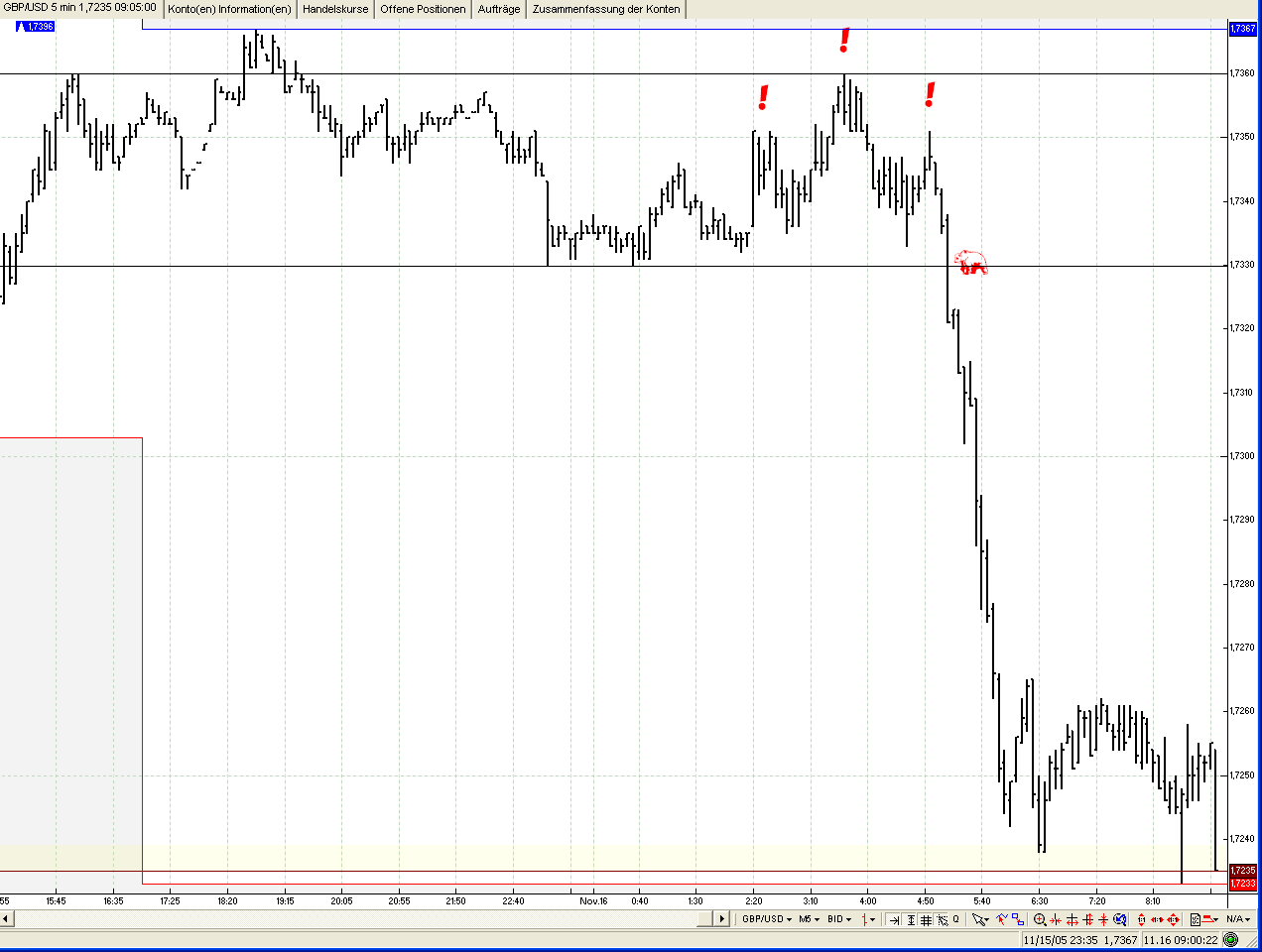 wo würdest du denn aktuell den stop sl setzen, wenn du bei 1.1712 eur short reingekommen wärst ? gewinnmitnahmen wären schon angebracht gewesen und den rest mit stop 1.1705 ca. jetzt zählt doch auch nicht mehr der 5min chart, sondern erstmal der 1h chart.Wenn ja, ist gut - und wenn nein, ist auch gut. Enttäuschung ist mir eine Beglückung, denn zuvor war ich getäuscht, danach ist die Täuschung aufgehoben. (Janosch)