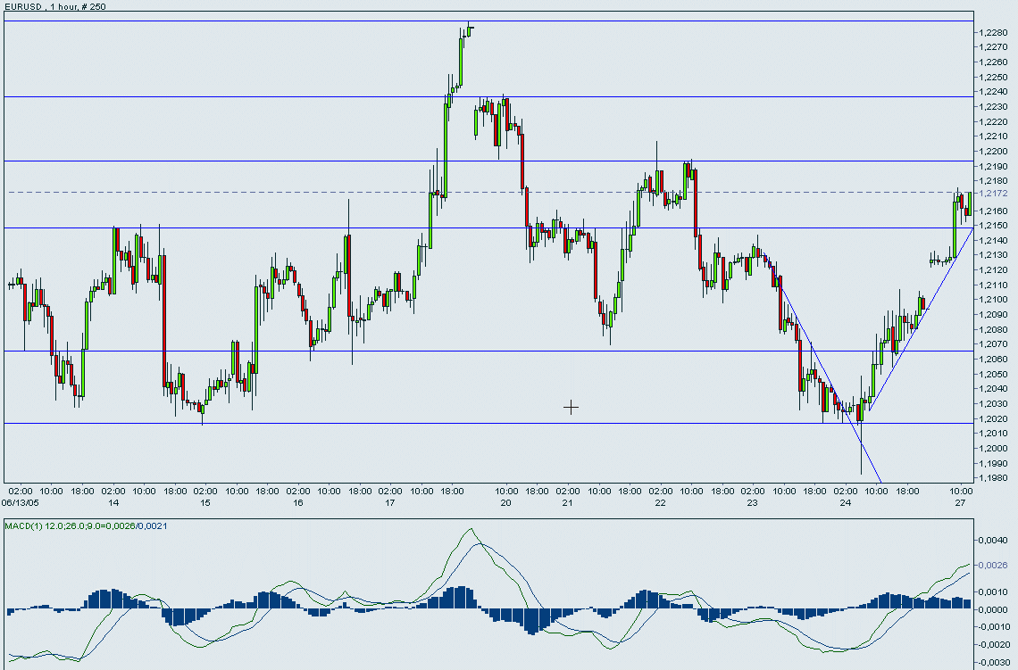 also ich bin ja wahnsinnig (nach meinem System bullisch gestimmt) Ich weiß daß viele Trader nach Kerzensignalen handeln. Wie vorhin erwähnt, hat das Pair mit der 10 Uhr-Kerze en bärisch Engulfing gezeigt. Ich bin jedoch der Meinung das ist ein falsches Zeichen. Denn die 2-er-Formationen funktionieren nicht immer. Bestes Bsp. am letzten Freitag 24.06.05. Mit der 14-Uhr-Kerze hatten wir ebenso ein sogar noch besser ausgeprägtes bärisch Engulfing im Std.-Chart. Danach gings, wie Ihr ja wißt, weiter nach oben, statt nach unten. Also in 2 Tagen schon 2 Mal ein false move. Deshalb meine Meinung: Trends sind stärker als Kerzensignale. Wie geht Ihr damit um?