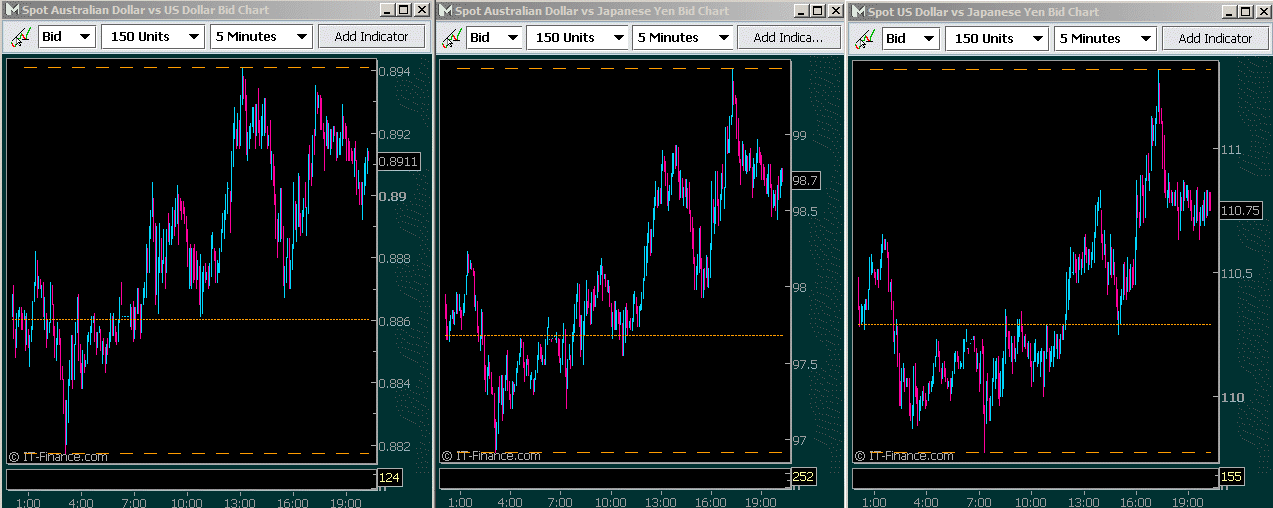 Wer einmal Charts von AUDUSD - AUDJPY - USDJPY nebeneinander stellt, wird schnell sehen dass das Mittelpair (hier also AUDJPY) bei jeder parallelen Bewegung von AUDUSD und USDJPY den Turbo einschaltet. Und diese parallelen Bewegungen gab es seit Monaten mehrmals pro Woche.