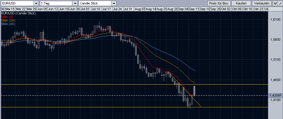 Ich bin zwar kein Experte, aber ich glaube wir kommen in eine Seitwärtsbewegung zwischen 1,39 und 1,45 (wenn die Fundamentals nicht zu einer Fortsetzung des Abwärtstrend führen). Wäre auch zu schön und zu einfach, wenn der Kurs ohne Pause straight nach oben oder unten wandert :D.