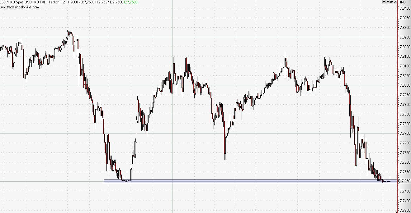 Es geht hierbei um den USD/HKD. Dieses Pair ist an ein Niveau angekommen, von dem man eine gewisse Unterstützung erwarten kann. Der Kurs bewegt sich seit einiger Zeit schon auf diesem Nivau.