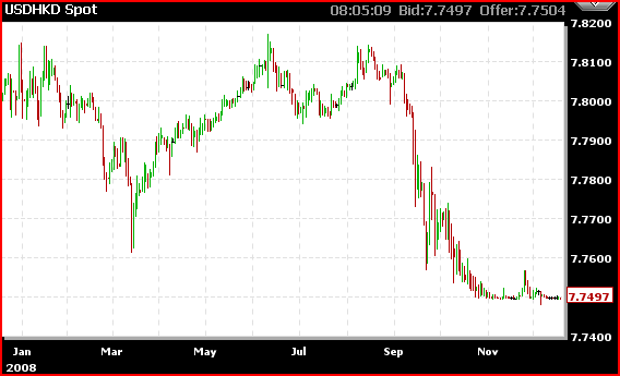 Under Hong Kong's currency board system, the Hong Kong dollar is pegged at 7.80 to the U.S. dollar, but is allowed to trade between 7.75 and 7.85.