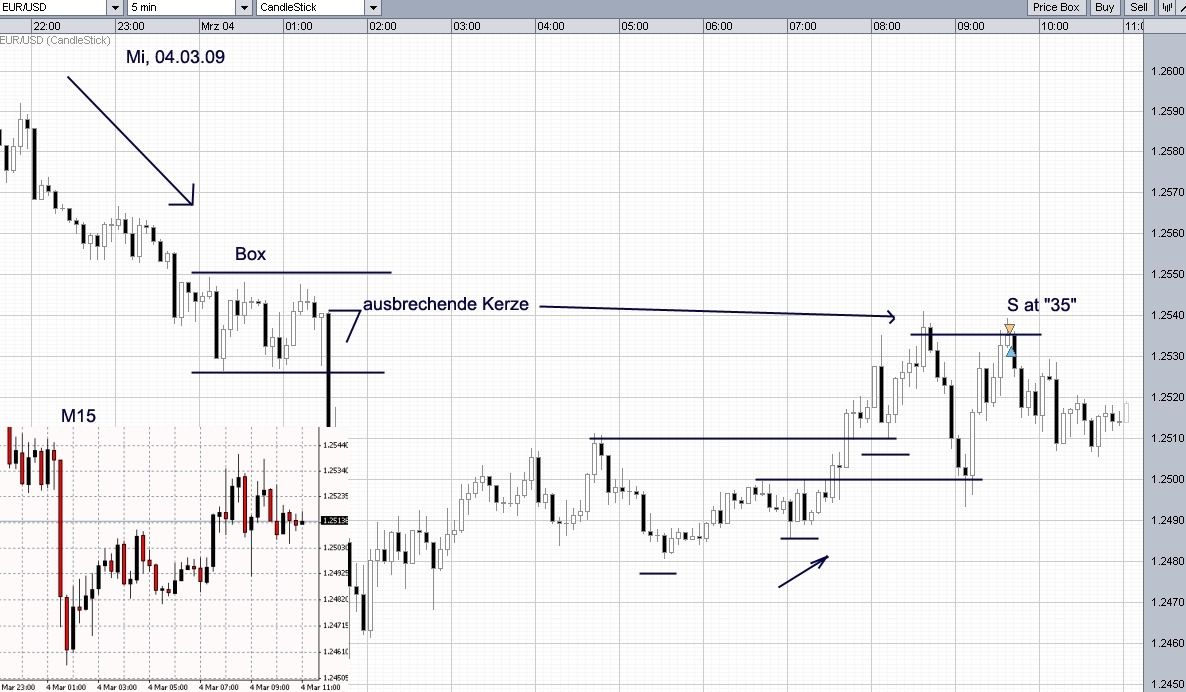 - Wenn ich davon ausgehe, dass die Profis (Hohe Risk Aversion) den Short hinter der Box mit SL absichern (ca. @50), so ergibt sich bei 10-15 Pips Risk ein Short Entry bei ca. 35 – Bingo! (CRV theoretisch ca. 2:1)