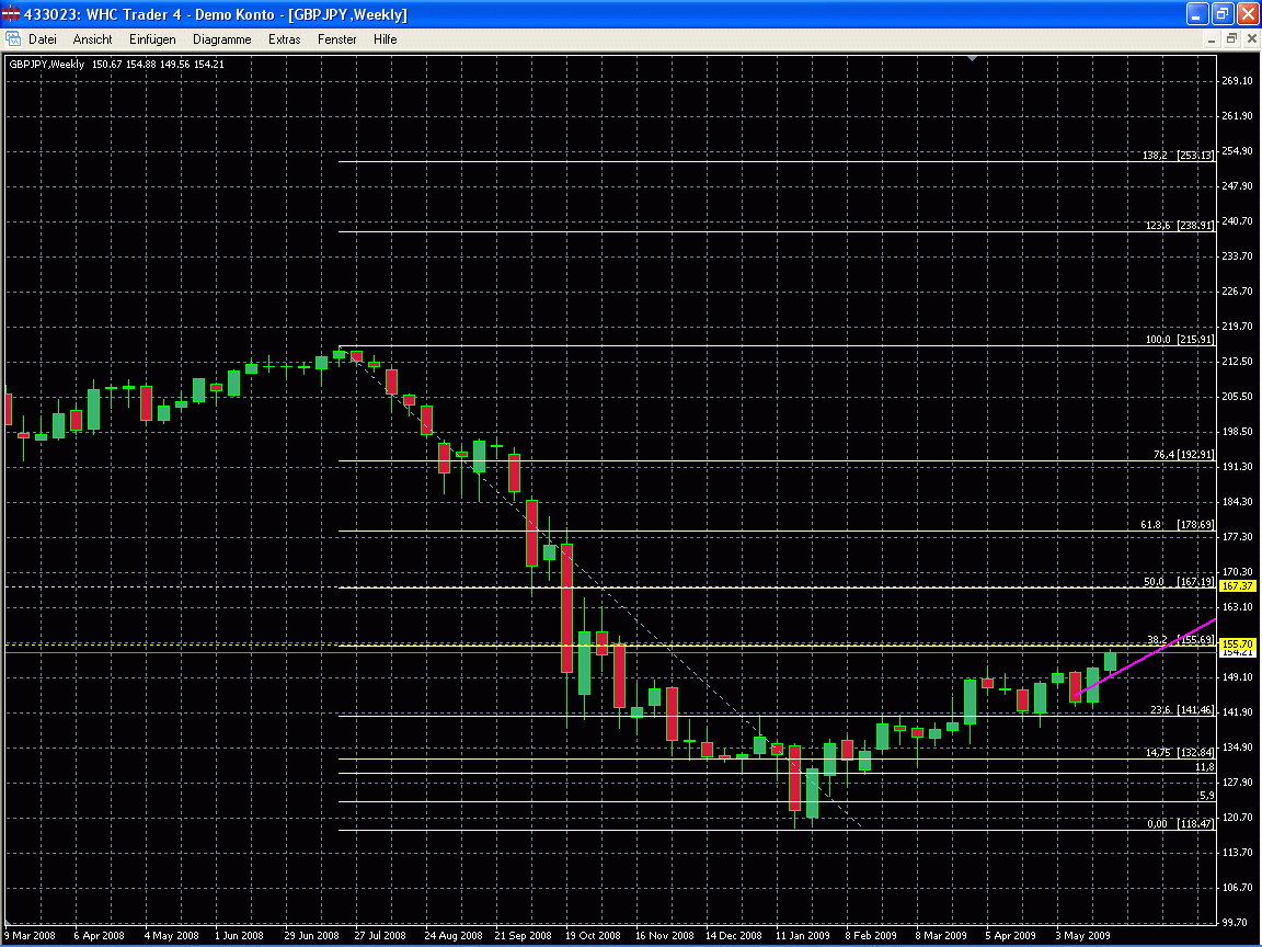 2 rosa Trendlinien eingezeichnet, vermutlich halt bei 153,56, tiefer dann 151,63 ( hier fallen fast zwei unabhängig errechnete Punkte zusammen aus Gann und Regressionsbetrachtung) ab hier sollte er sich schleunigst nach oben bewegen, sonst sehen wir das 50 Rt im Wochenchart nicht so schnell.