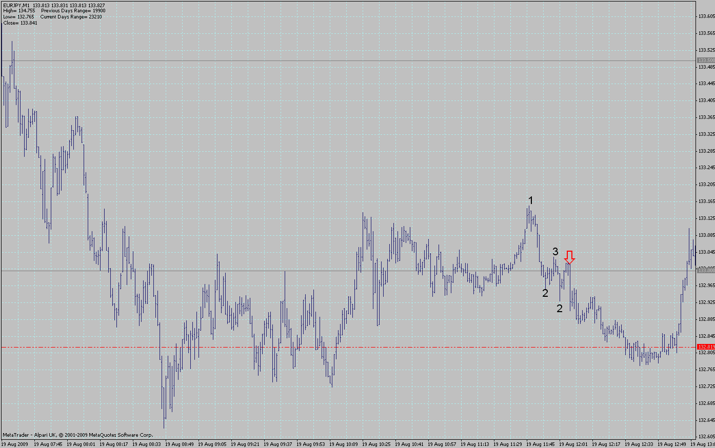 Im 5m kann man von diesem angeblichen Setup nichts sehen, und im 1m bezeichne ich das als Zufallsgewurschtel im Marktrauschen! Das ganze hätte genauso gut bei 132,95 wieder nach oben drehen können. Das hatte es vorher schon 6 mal gemacht.