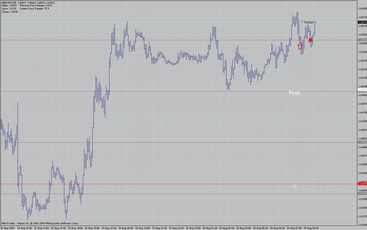 In dem Fall -Mittagszeit, mit langen Trends eher nicht zu rechnem, Standardstop (10 Pips + ungefährer Spread)- war der Ausstieg bei irgendeinem Pivot -ist auf dem Chart von Dachs als rote Linie zu sehen- ergibt als CRV irgendwas in der Gegend von 1,2, das ist unter diesen Voraussetzungen für mich okay.