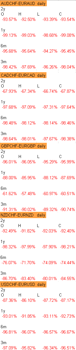 Der Tageschart des AUDCHF-EURAUD Vergleichs ist fehlerhaft dargestellt worden. Der Server hat für AUDCHF nur Daten bis Februar geliefert, wodurch dann eine Verschiebung zu Stande kam. Deshalb, wen es interessiert, unten noch mal der Vollständigkeit halber komplett. Passt dann auch zu Excel, siehe zweites Schaubild."I'm a trader, baby. So, why don't you kill me?!" -
