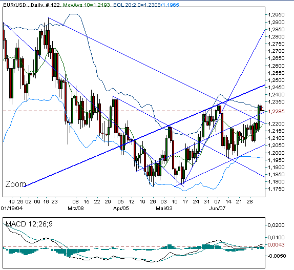 Um eine Richtung auszumachen sollten die 1,2335 (Tageshoch vom 04.07.) bzw. 1,2270 (Tagestief von gestern & heute) nachhaltig durchbrochen werden.