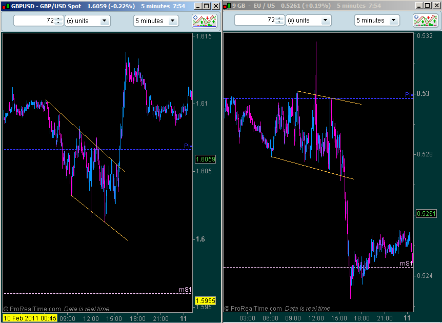 Stelle mal 2 Charts rein. Links Original GBPUSD vom 10Feb2011, rechts eine spezielle Berechnungsweise basierend auf dem gleichen Kurs. Dieser läuft grundsätzlich Seitenverkehrt (nicht Reziprok). In der "Jam - Session" (markiet) laufen sie paralell. Der spezielle immer entlang des Pivot. Da ich meinem Machwerk vertrauen kann, habe ich diesen GBPUSD Ausbruch-Spike, sagen wir einmal, erwartet. Hat dann eine schöne mS1 Landung hingelegt. Während Original irgendwo im Nirvana.