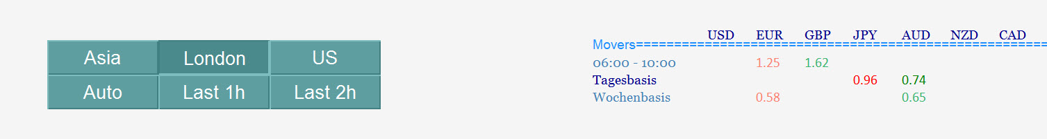Man könnte sich auch was Übersichtliches programmieren, um angezeigt zu bekommen welche Währung aktuell oder in einem gewünschten Zeitrahmen gegen alle anderen auf- oder abwertet. Als ersten Fingerzeig sozusagen ohne zuerst zig Charts vergleichen zu müssen... -