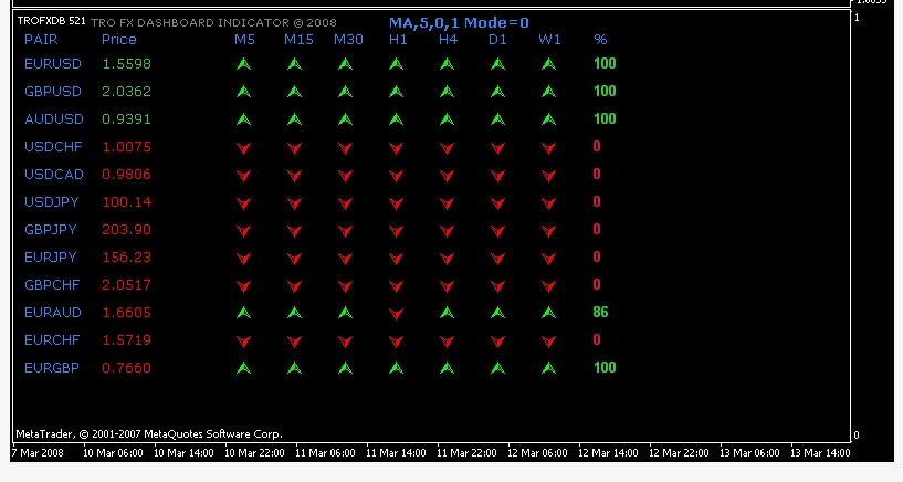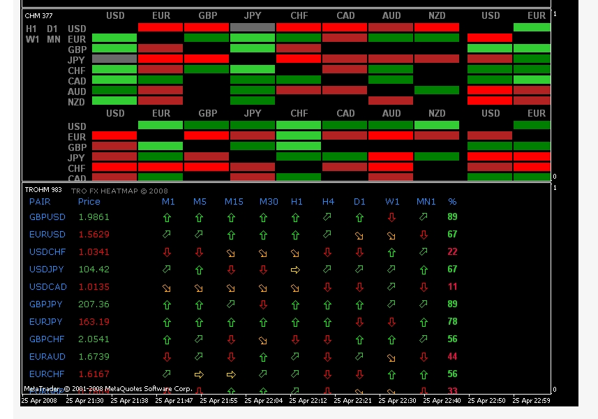 Agree. Nur mit den Basics ausgestattet konnte ich eine auf meine Wünsche zugeschusterte Marktinfoseite im Metatrader programmieren. Der Screenshot zeigt nur den unteren Teil der Seite und gibt die schwächste und stärkste Währung eines gewünschten Zeitrahmens aus (die Zahl ist nur ein Maß mit welcher Volatilität die Währung auf- oder abwertet).