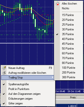 funktioniert der Trailingstop ? Nach zwei Minustrades mit dem Handelssystem (Stop 25 pips, Trailing Stop 35 pips) war der dritte Trade erfreulicherweise schon im Plus (ca. 70 pips). Allerdings wird der Stop nicht nachgezogen und die Sau dreht sich im Moment wieder ins Minus. Also hätte ich eigentlich schon (mit Profit) ausgestoppt werden müssen... heiho, sag mal bitte was dazu wenn du was weisst. Ich guck mal bei den Russen vorbei