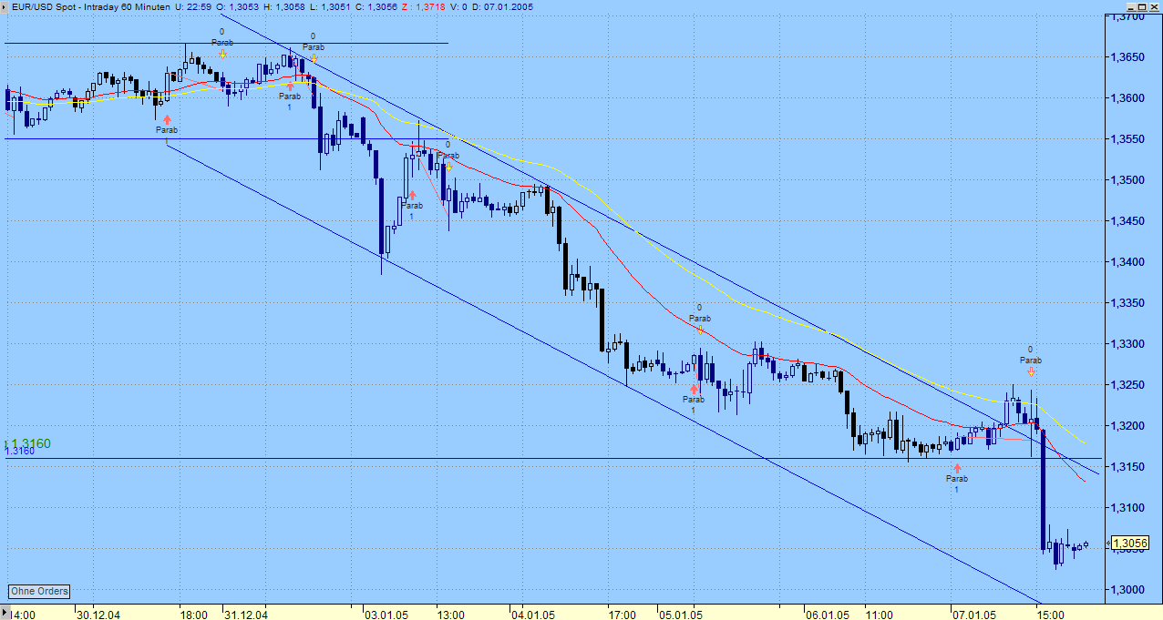 Die EMA's haben die Parameter 10 und 40, unten läuft noch ein Stocastik und ein DMI+ DMI- ADx/ADXR mit, aber die Handelsenstscheidung treffe ich selbst, meine Erfahrung filtert einige Signale ganz gut weg, hat auch recht viel mit der Uhrzeit zu tun, so a la Big Ben. -