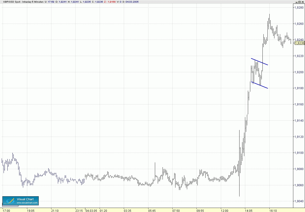 Ich will in meinem Beispiel auf den Cable eingehen. Nach einiger Zeit im Trend bildete sich eine Flagge - natürlich noch im Bereich des runden Kurses - ich habe sie am Chart zum besseren Verständnis eingezeichnet. Klar, besonders schön ist das Teil nicht, aber am 5 min Chart bilden sich die wenigsten Formationen "lehrbuchmässig" aus.