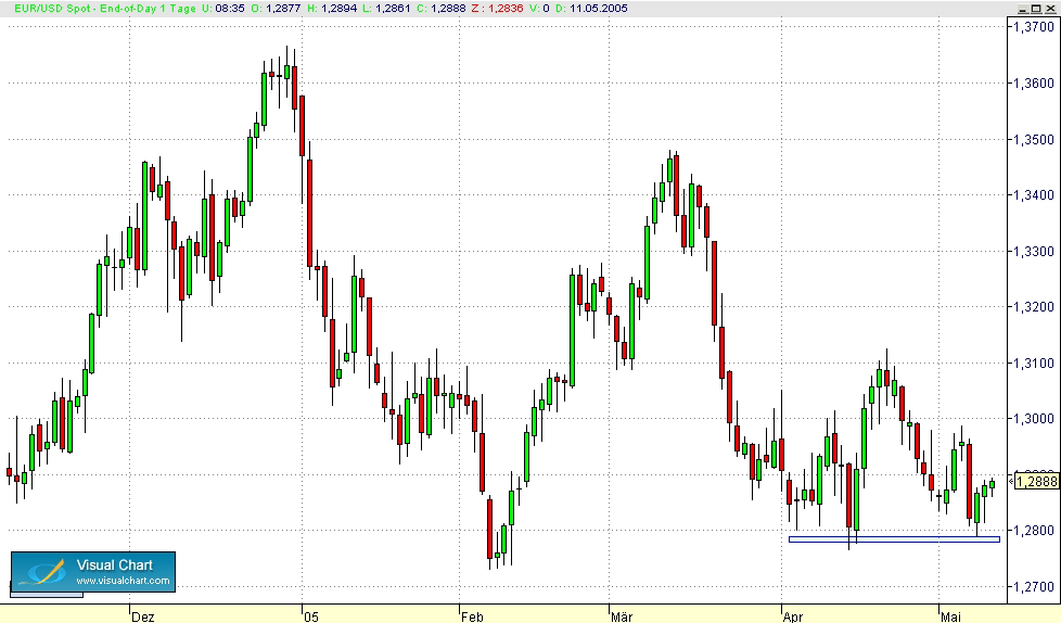 Den Trade ging ich ein, da EURUSD im blau markierten Bereich gute Unterstützung fand, Entry war 1,2805.