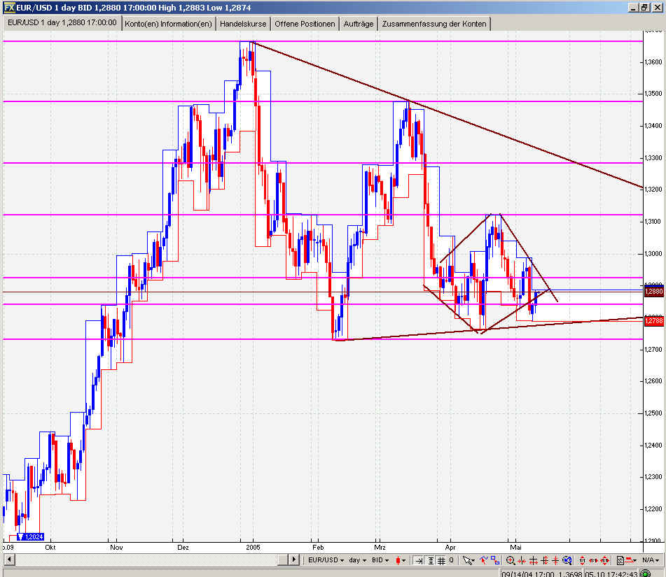 Ich sehe am Dailychart im EURUSD auch eher Potenzial nach oben, bin mit einem - für mich sehr atypischen Swingtrade auch schon Long positioniert - allerdings kann sich heute Nachmittag die ganze Situation gravierend ändern, US Handelsbilanz ist immer für heftige Moves zu haben.