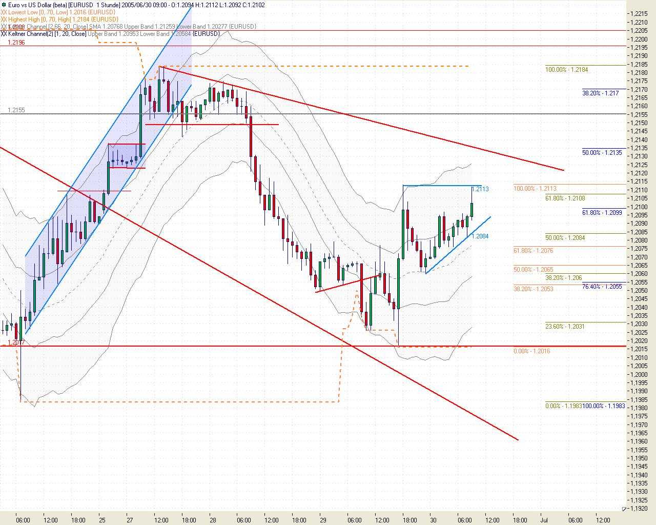 Sollte er die 1,2113 von gestern überwinden, kann es schon noch mal ein paar Pips hoch gehen. Grenze in der Nähe 1,2142 (aus angepasster gestrichelter Linie im Daily Chart)