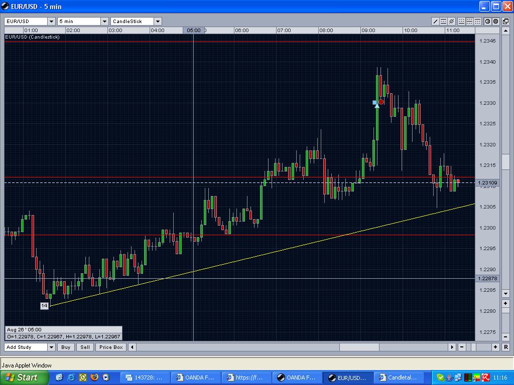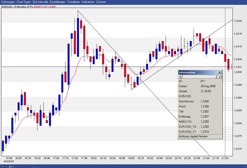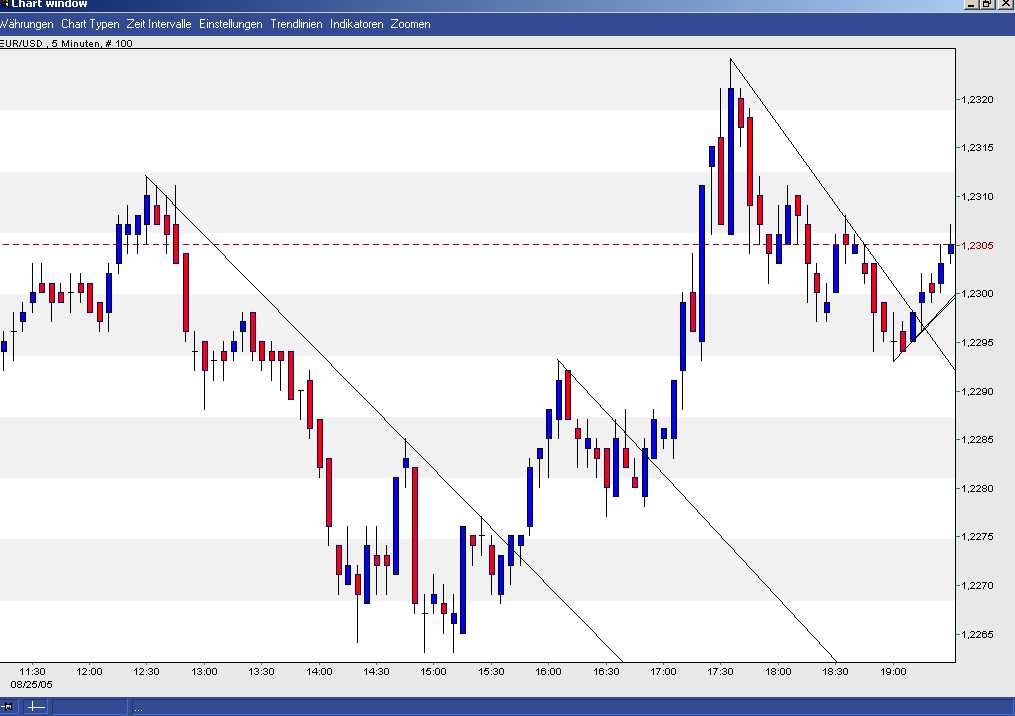Bei konsequenter Beachtung der Trendlinie - hier auch bestätigt durch den EMA 10 - hätte ein Ausstieg mit der 20:55 h Kerze zu 1,2308 erfolgen müssen.