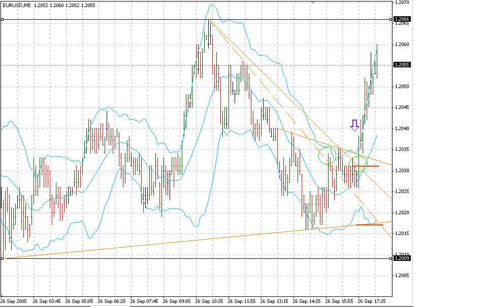 Hier im Euro nochmal eingezeichnete Trendlinien. Der BReak kam ja vorhin. Hier hätte man aus dem eingezeichnetem Kreis heraus beim break Long gehen können. Vorangegangener Bruch wäre schief gegangen. Auch ein Ausbruch aus dem Dreieck wäre noch vielversprechend gewesen (oberhalb des grünem Ausbruchskreises)