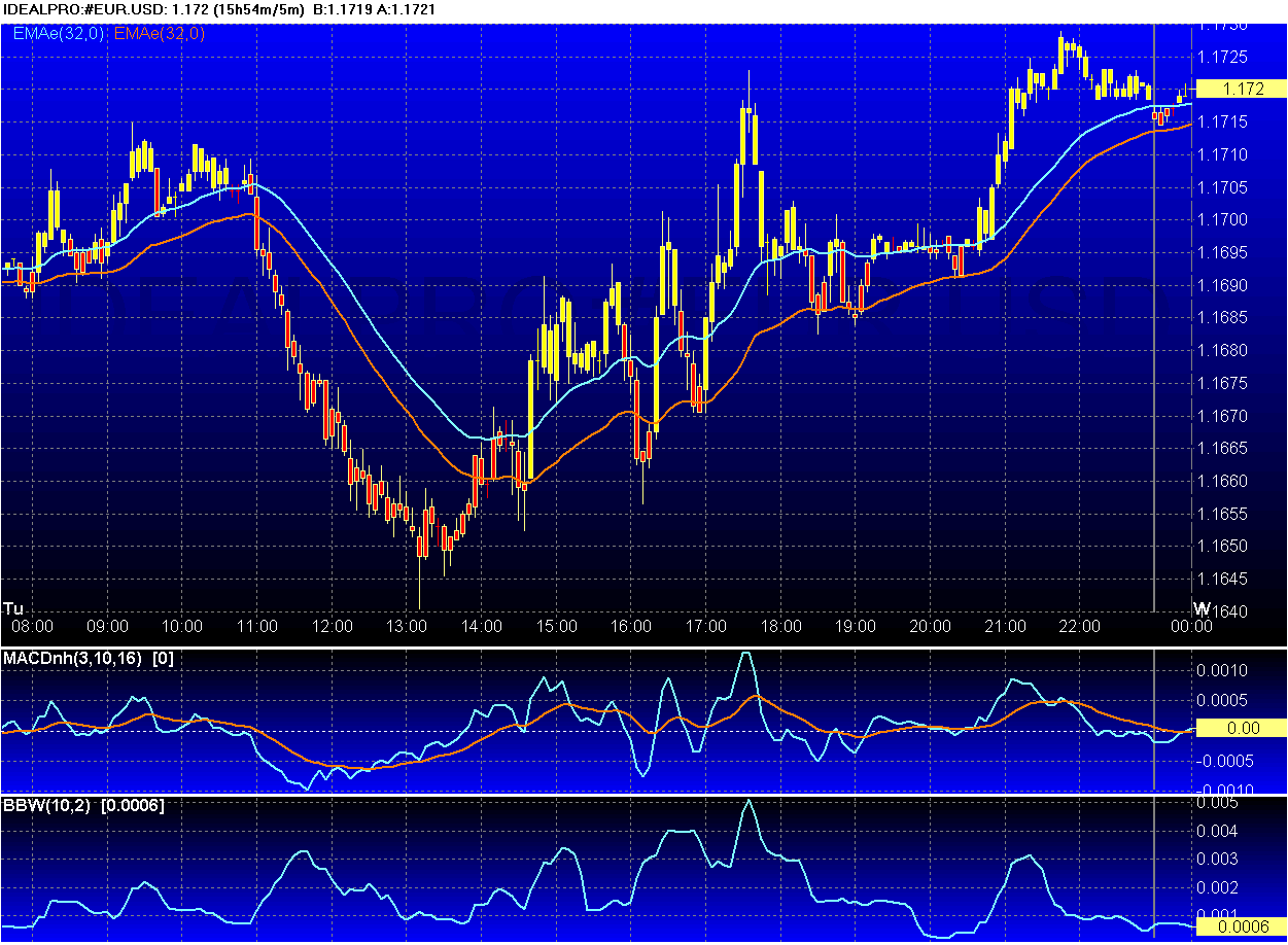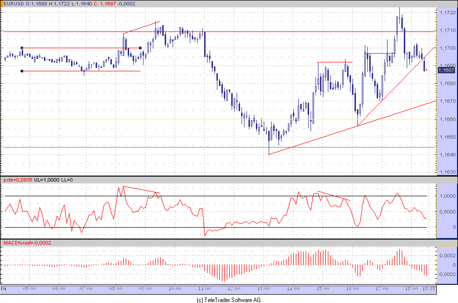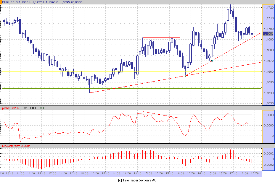 eben konnte man schön sehen,das der trend noch nicht zu ende war,im euro-usd und die candle haben es auch gezeigt.das ist wichtig,da man sonst zu früh eine divergenz vermuten kann. erste tief vom macd und die candle formation-in verbindung mit dem aus den bändern laufen des % b zeigen den momentanen trendschluß.chart folgt
