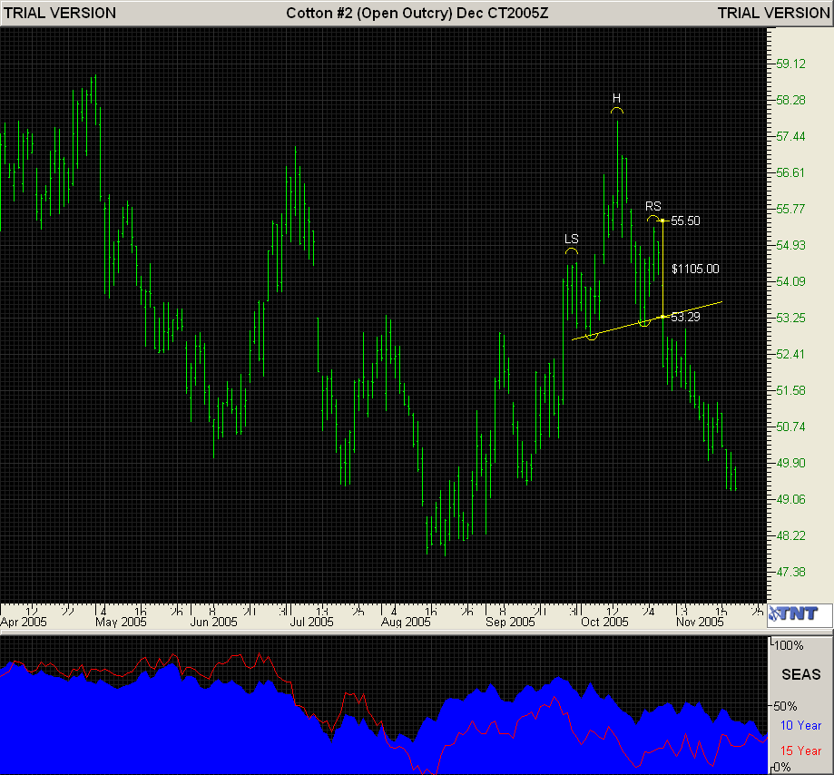 Im Dezemberkontrakt von Cotton#2 gab es eine relativ klare SKS Formation, wenn man diese gehandelt hätte, wäre der SL über dem High der rechten Schulter zu platzieren gewesen, das hätte aber bereits bei einem Kontrakt ein Risiko von USD 1.105,- + Kommissionen und Gebühren bedeutet.Dieser Beitrag wurde bereits 1 mal editiert, zuletzt von „goso“ ()