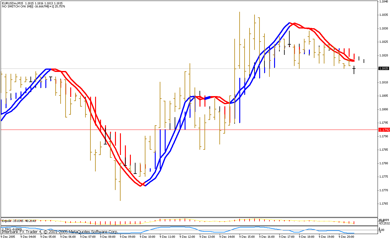 Kurzum die Entries vom Trendmanager sind auf 15 min. Charts durchaus zu gebrauchen, aber die Exits sind wohl nicht die besten. Grundsätzlich ist klar das die meisten Methoden am besten funktionieren wenn sich nach dem Entry Trends etablieren. Anliegend zwei Charts, einmal der Trendmanager und dann mit der Voilamethode, wobei die Kursbalken hier nach dem CCI 34 eingefärbt sind - Geld für CCI über Null, sonst rot.