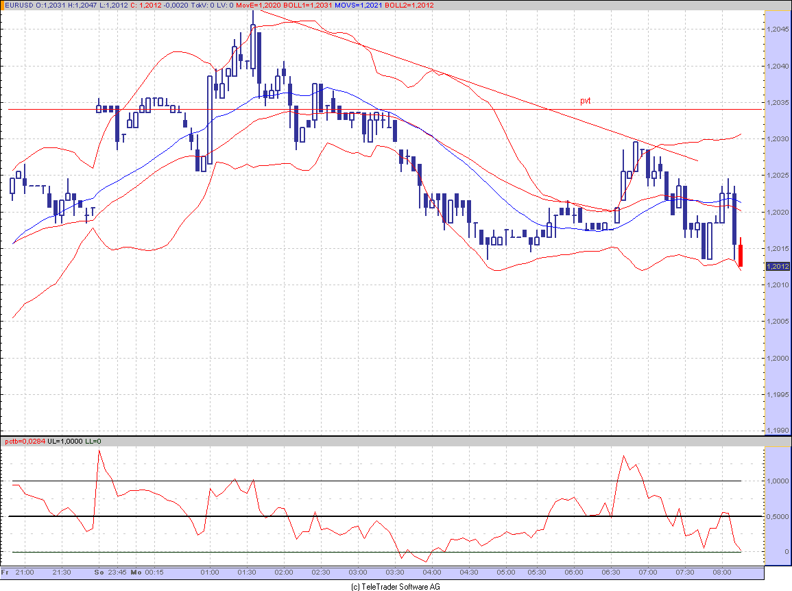 die irren sind aus dem markt,wenn sich ca 3 kleinere candle seitwärts bewegen.acht auf da 3 candle.es ist nur so eine erfahrung.eigentlich immer nach dem entry gibt es hinweise auf die richtung.bestätigt es nicht deine trendrichtung,sei SEHR VORSICHTIG.am bestern raus.ein ausbruch nach dem 3.(oder das 3. candle bedeutet der 2. schub kommt fast sicher.man muß seine order wohl besser vorher plazieren.nach einem so starken abwärtstrend kommt selten (nach dem 2.schub)eine starke gegenbewegung,warten bis TL beim % b geschnitten wird.