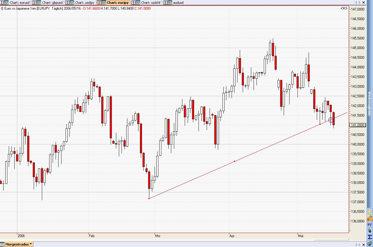 Die TL gestern im EURJPY @141,28. Hielt zwar nicht, war aber im Hoch für 50 pips im Tageshandel gut. (Und das obwohl zu dieser Zeit alle europ. Währungen gegen den USD abgaben) -
