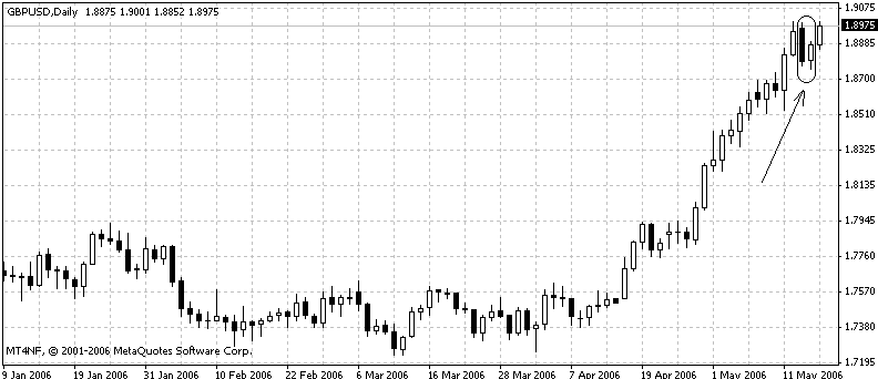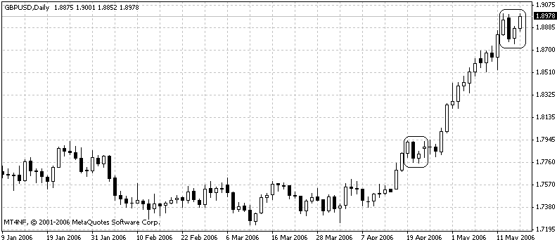 Erst ein Bearish Engulfing. Beim ersten mal ist es zwar nicht ganz korrekt, weil das open der schwarzen Kerze ein paar Pips zu tief liegt. Aber ich glaube das kann man manchmal vernachlässigen, sagt Nison, es ist die "Aussage" die zählt. Dann ein Harami, was im Prinzip das Bearish Engulfing wieder entkräftet. Dann wieder eine Kerze, welche höher geht. Im April war das zwar ein Doji und heute eine relativ starke, weisse Kerze aber der Tag ist noch nicht zu Ende.