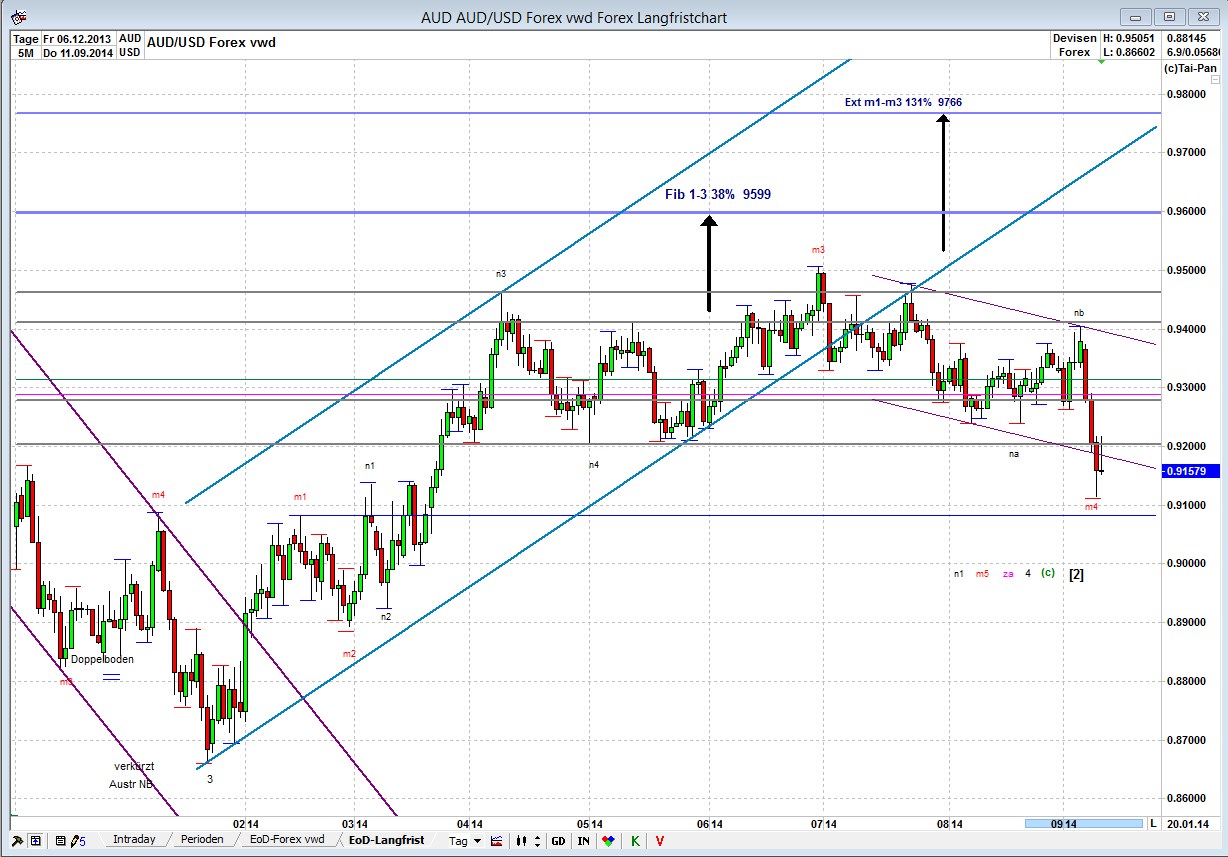 M.E. geht es nicht weiter abwärts, sondern die Impulswelle müsste sich mit m5 fortsetzen. Ziel Ext m1-m3 ganz oben.Jetzt heißt es ganz einfach abwarten, dass der Trend in D1 aufwärts dreht. Dann die erste Korrektur abwarten und einen Einstieg auf untergeordneter Ebene suchen.So lange kann man zuschauen und muss kein Risiko eingehen!