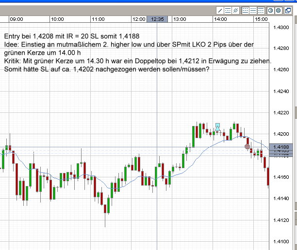 2. Ich schau immer auf den 1 min Chart zur Kontrolle. Da wäre dann nach dem 2. Hoch Schluß mit der Idee, da kein neues High. Ich weiß aber nicht genau, wann dein Entry war.