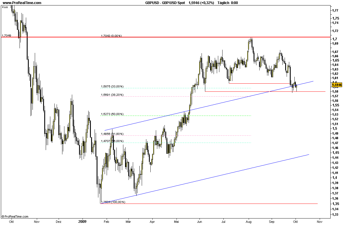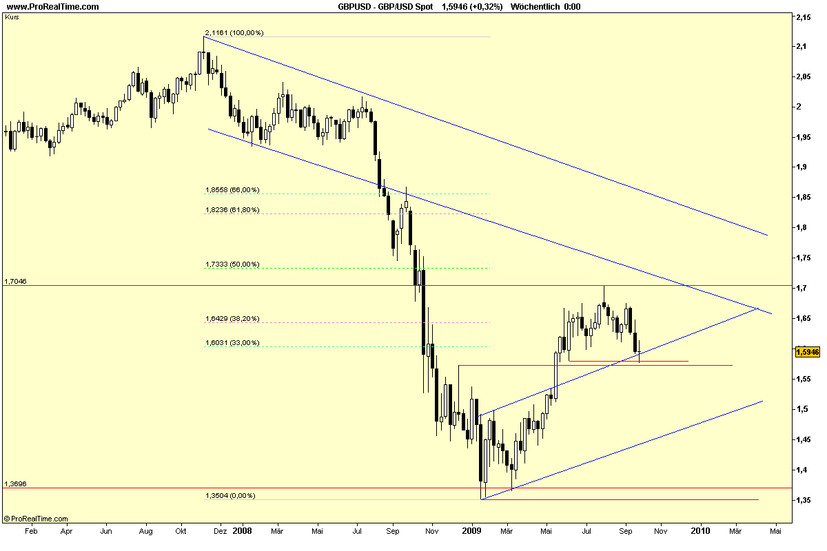 Der scharfe Abwärtstrend wurde im Cable inzwischen bis fast um das Normalmaß korrigiert. Es hat sich ein steigender Korrekturtrend gebildet, der schließlich über die obere Projektionslinie ausgebrochen ist.Im August wurde ein übergeordneter historischer Widerstand angehandelt und der Kurs fiel daraufhin bis an die obere Projektionslinie des Korrekturtrends. Hier wurde schließlich in der Wochenformation ein Doji gebildet, der mit seinem Tief unmittelbar an zwei übergeordneten Unterstützungslinien anliegt. Hier können grundsätzlich zwei Möglichkeiten hergleitet werden.