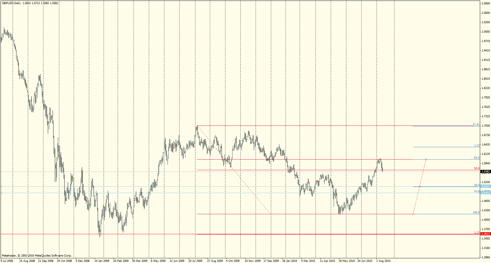 Meine Sicht: 61er weekly Retracement Fib hat gehalten. Downtrend damit intakt. Ziel 1.23 Extension bei 1.3600 was auch mit einem Test der 2009er lows übereinstimmen würde. Long Möglichkeiten beim 50er Daily Fib @ 1.5117 und 61er @ 1.4913 oder falls doch das 61er Weekly Fib überwunden werden sollte. Falls wir doch einen Bounce von Daily 50er oder 61er bekommen sollten, wäre die 1.61er Extension exakt bei den 2009 Highs. Die long-term Ziele sind damit klar definiert.