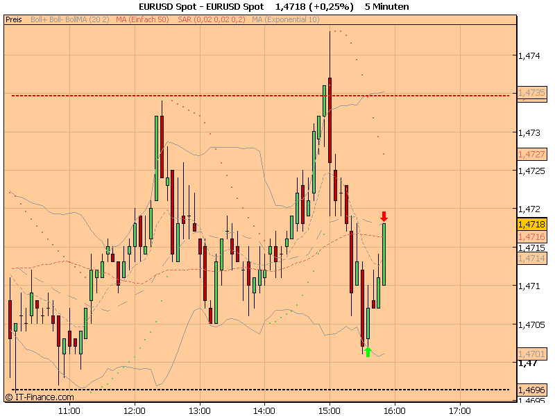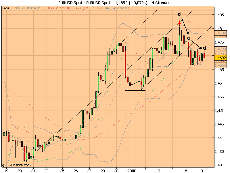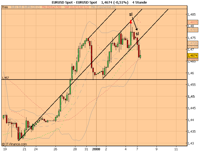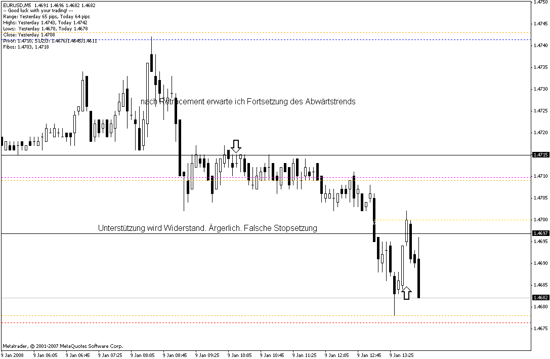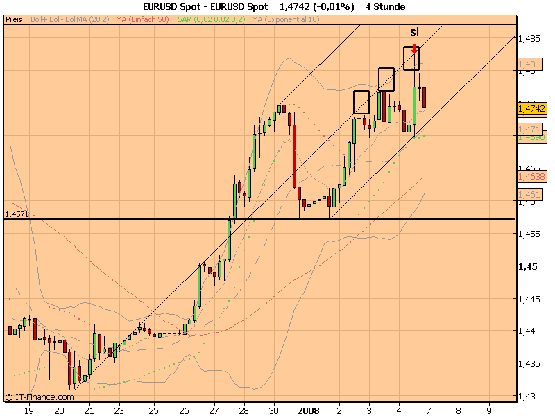 Meine Einschätzung zu diesem Trade: Einstieg eigentlich recht gut gelungen. Hat zwar lang gedauert, bis der Dollar aus der Range ausgebrochen ist, aber das untere Ende war wahrscheinlicher, da ein Abwärtstrend vorlag. Leider hab ich beim Exit nicht daran gedacht, dass die vorherige Unterstützung ja dann zum Widerstand wird, und bin dann unglücklich ausgestoppt worden. IS lag bei 1,4720, knapp über Verlaufshoch.Lebe nicht um zu arbeiten, sondern arbeite um zu leben.Dieser Beitrag wurde bereits 1 mal editiert, zuletzt von „matsf“ ()
