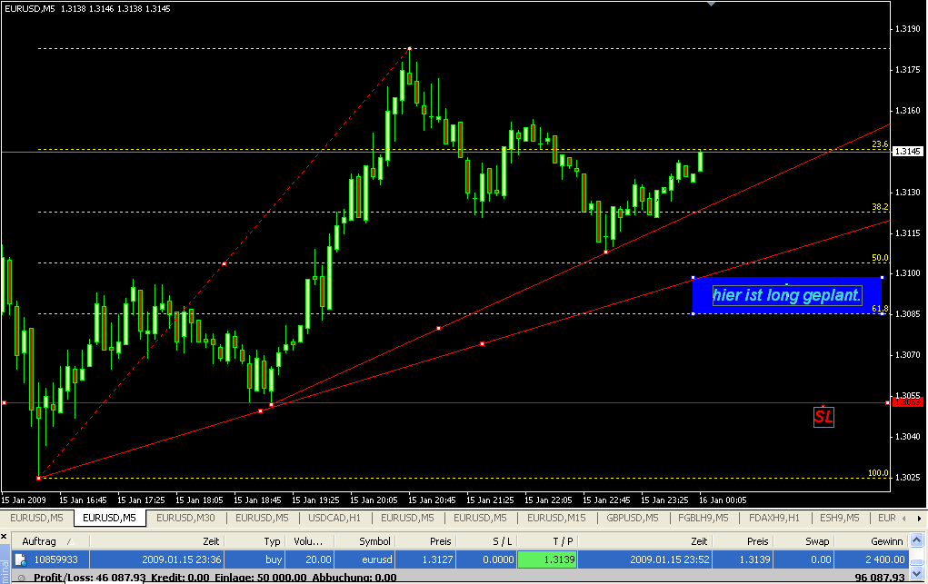 Man erkennt einen setup - in diesem Fall die Wahrscheinlichkeit eines niedrigeren highs an einem Sweetpoint (nennt man die 100er im Euro auch so?) - und dann ist man beim Aufgeben der Order zu langsam und kommt, wie hier, erst zu 94 rein (IR=10). Im Ergebnis + IR, wenn man schneller gewesen wäre, hätten es bei gleichemn Risiko aber auch 1 1/2 od 2 IR sein können.