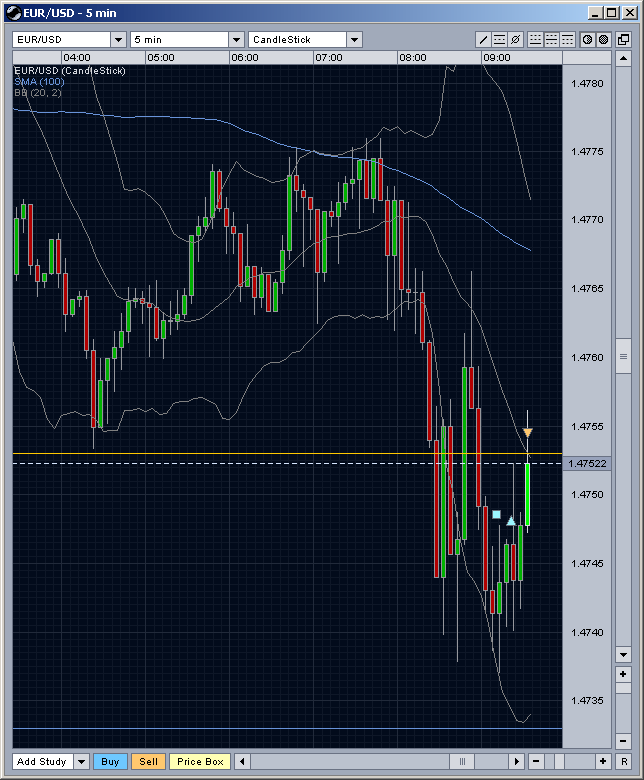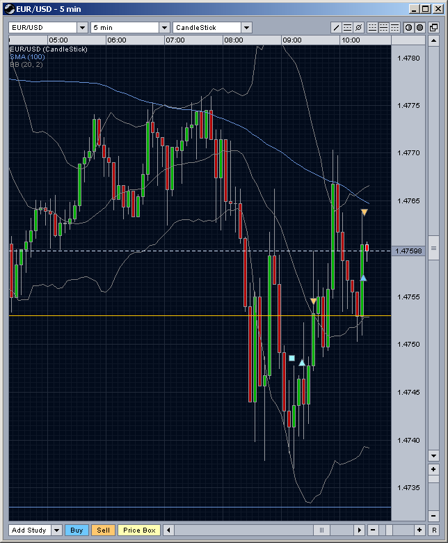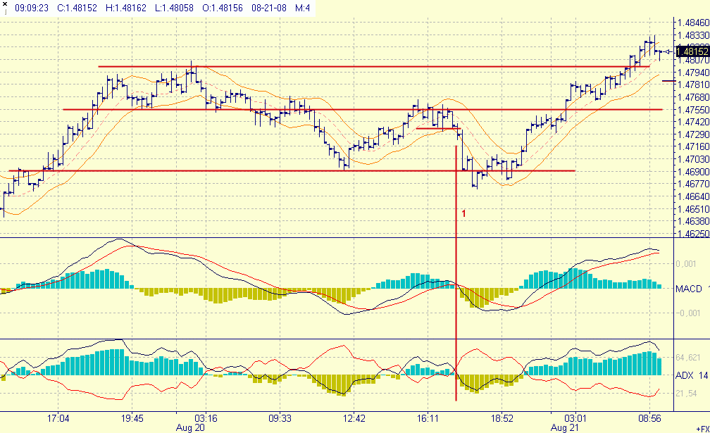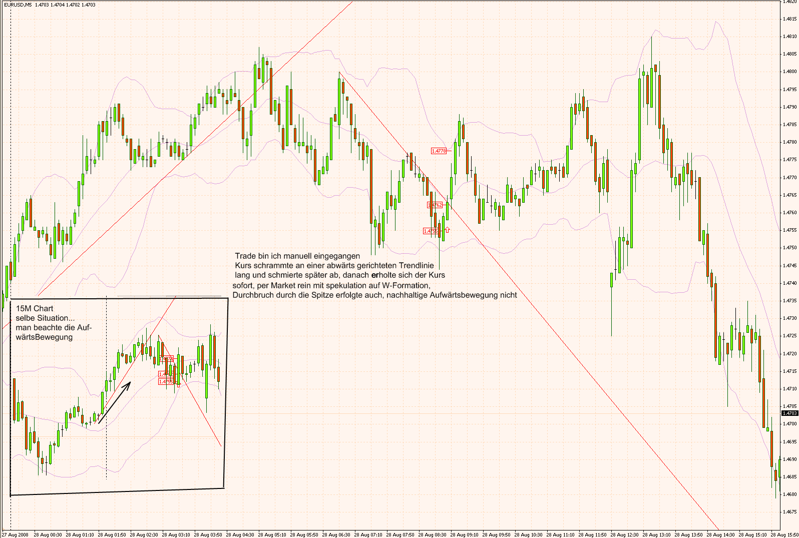 Solange der DMI im größeren Chart auf short steht wird nur short getradet, steht er auf long eben nur long. Seitwärtstrends erkennt man erst nach einer gewissen Zeit und tradet short und long, jeweils immer dann, wenn der Kurs im großen Chart am oberen bzw. am unteren Keltner ist.