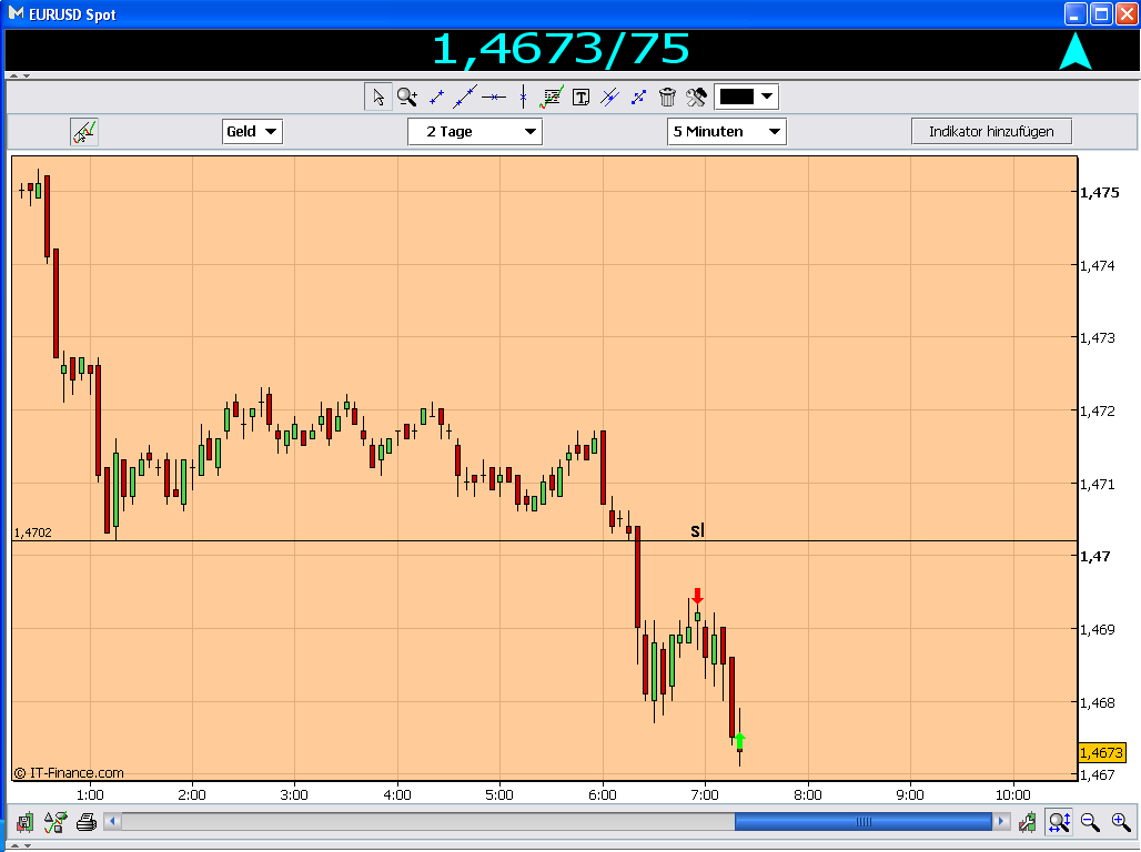 Die Einstiege suche ich im kleineren Chart. Dazu sind die Histogramme sehr wichtig. Beginnen die Histogramme zu steigen oder zu fallen und schließt der Kurs über oder unter der Mittellinie im Keltner, gehe ich long oder short. Der Stop ist jeweils unter dem letzten Tief oder über dem letzten Hoch. So ist m.M. nach das Risiko am geringsten.