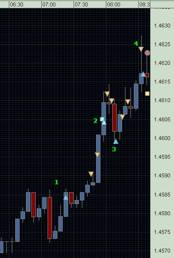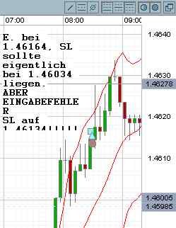 Trade 2 war ein reiner Ausbruchstrade. Da sieht man auch auf der Grafik, das ich dort eine Limit Buy Order drin hatte. Große Position, aber die mache ich bei der Art des Tradens schnell zu, wenn es nicht unverzüglich weiter hoch geht - bzw. mach ich schnell bei +5Pips mit 50% der Posi oder etwas mehr Kasse und Rest SL auf Einstand (obwohl ich mir die Sinnhaftigkeit hierfür noch überdenken muss, da ich fast immer ausgestoppt werde).Mihcat schrieb: