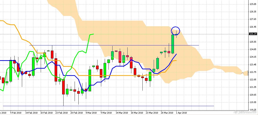im Ichimoku ist er an der oberen Wolke abgeprallt. Man sagt ja die fungieren als Widerstand. Mal sehen. 127,00 wird er nicht so einfach nehmen. Bin eher Long ausgerichtet, aber das Gesamtbild im Tageschart ist schon noch Short geprägt durch die letzten Monate. Wir werden sehen.